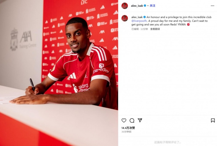 伊萨克表示:“很荣幸能够加入利物浦这个不可思议的俱乐部。对我和我的家人来说,这都是值得骄傲的一天。迫不及待地想尽快见到你们,红军们!YNWA(永不独行) 🔴”
